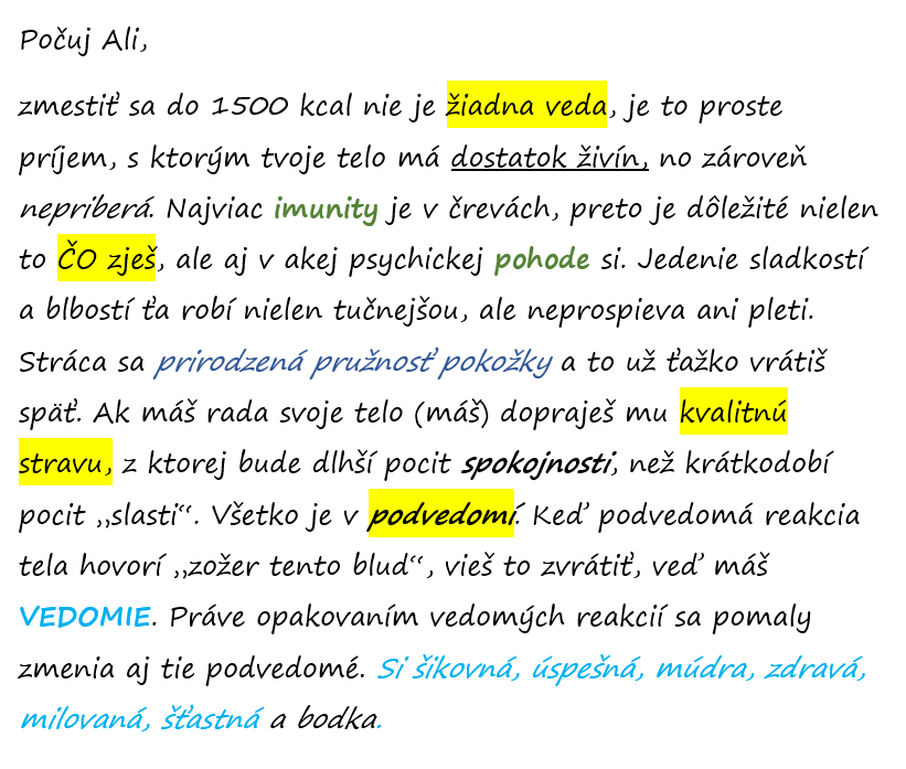 Svoj "list" na pripomenutie napíšte ručne, použite zvýrazňovačky pre podčiarknutie pozitívnych hlavných slov, tak aby ste z diaľky už videli "oč kráča" a tento list noste aspoň prvé dni pri sebe. Vždy ak sa bude schyľovať k prešľapu prečítajte si tento list.